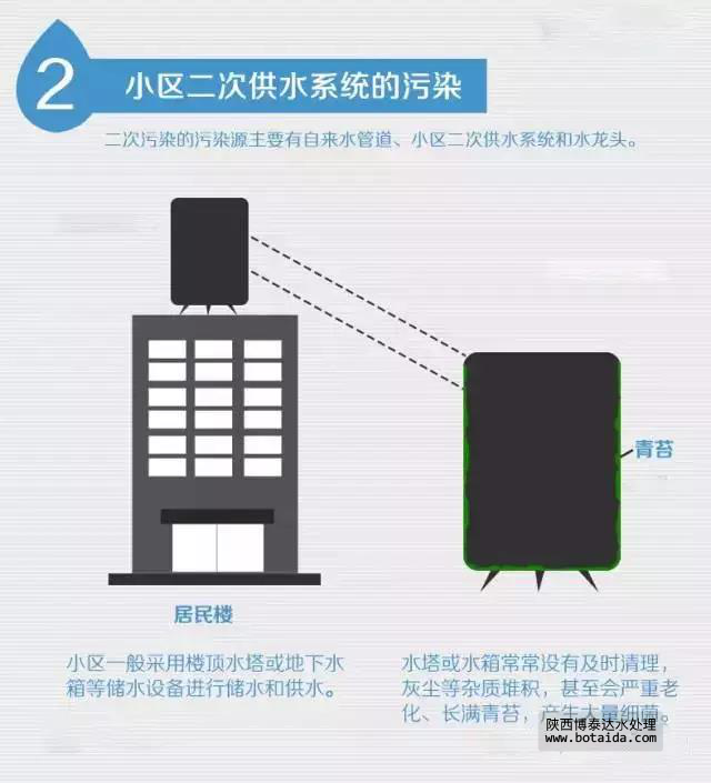 小區(qū)一般采用樓頂水塔或地下水箱等儲水設(shè)備進行儲水和供水。而水塔或水箱常常沒有及時清理,灰塵等雜質(zhì)堆積。有的儲水設(shè)備甚至?xí)?yán)重老化、長滿青苔,產(chǎn)生大量細菌滋生。