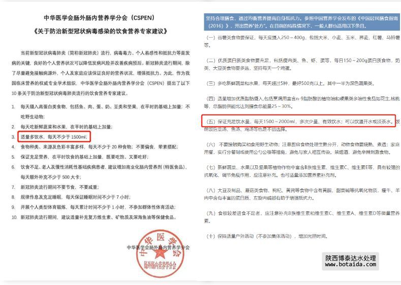 中國(guó)營(yíng)養(yǎng)學(xué)會(huì)、中華醫(yī)學(xué)會(huì)、地方衛(wèi)健委等機(jī)構(gòu)發(fā)布的“防治新冠病毒感染的飲食指南”中,也多次提到要保證每天1500ml~2000ml的飲水量,多次少量,有效飲水。