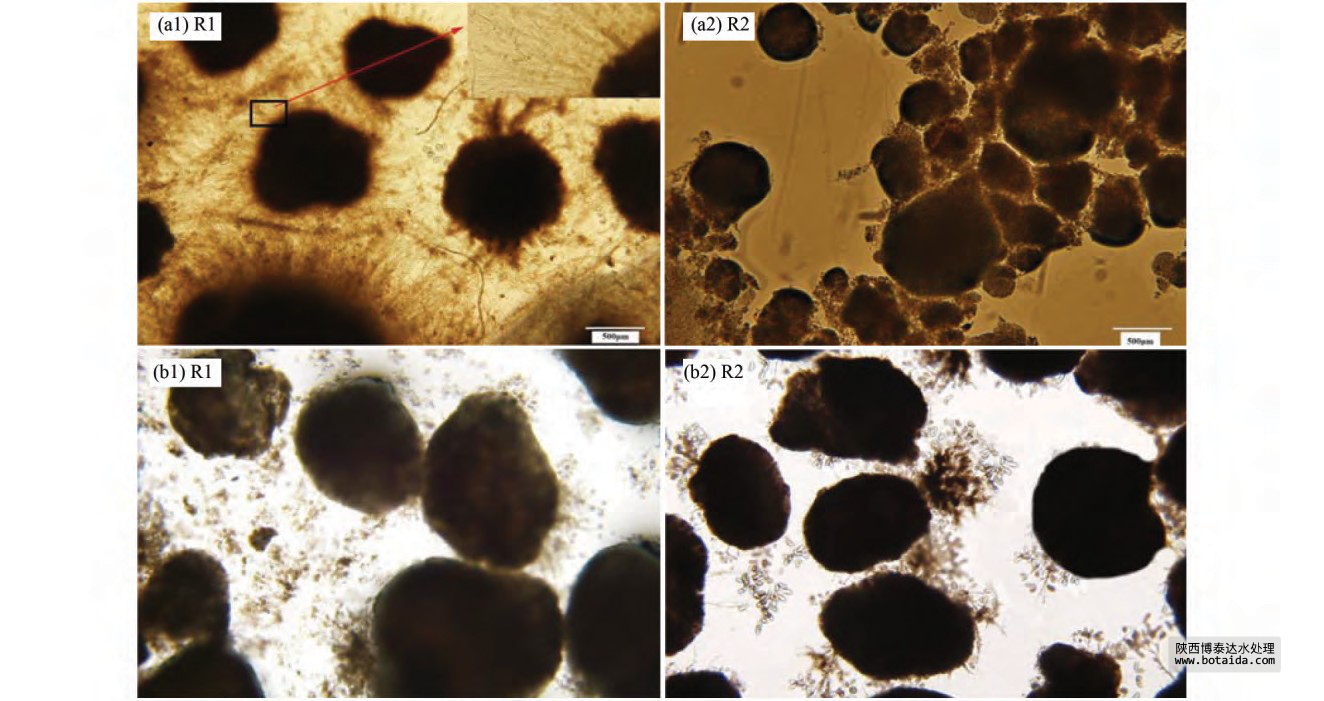 ( a1) R1 和( a2) R2 為 70 d 的顯微鏡照片,( b1) R1 和( b2) R2 為 130 d 的顯微鏡照片圖 3 R1 和 R2 反應(yīng)器中顆粒污泥的顯微鏡照片