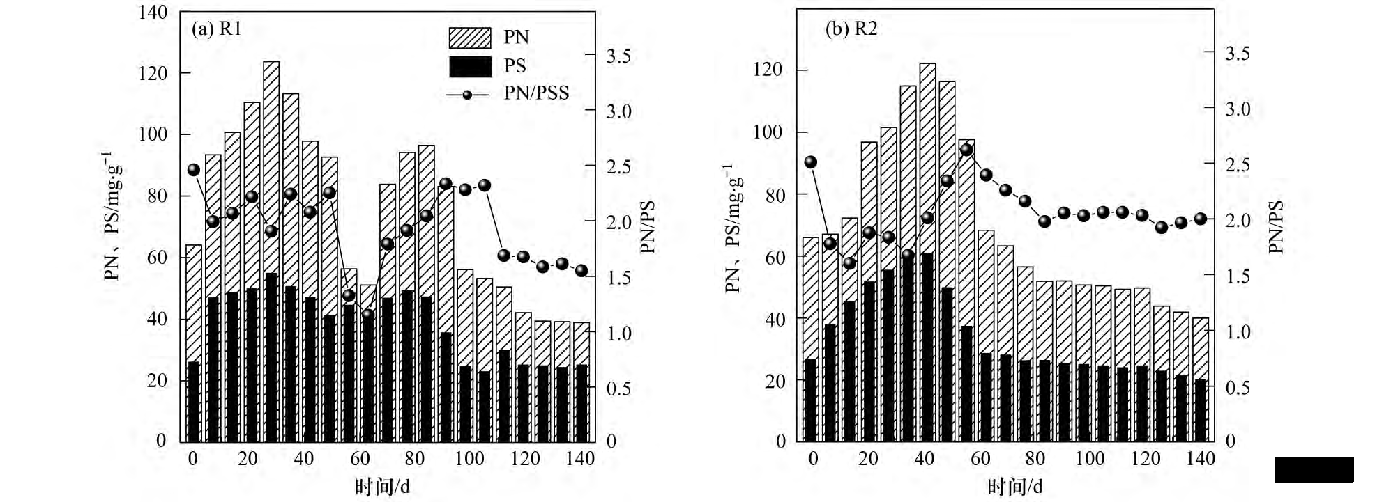 胞外聚合物( EPS) 主要由蛋白質(zhì)( PN) 和多糖 ( PS) 組成,在污泥顆?;^(guò)程中具有重要作 用. 如圖4 所示,PN、PS 在顆粒污泥啟動(dòng)階段 ( 0 ~ 25 d 和 0 ~ 42 d) 整體呈上升趨勢(shì),R1、R2 內(nèi)的 PN 含量( 以 MLSS 計(jì)) 分別由初始的 64. 12mg·g - 1 、65. 98 mg·g - 1 增 加 到 最 大 值 123. 65mg·g - 1 、122. 19 mg·g - 1 ,PS 含量分別由初始的26. 08 mg·g - 1 、26. 59 mg·g - 1 增加到最大值 64. 89mg·g - 1 、62. 13 mg·g - 1 . PS 越高,污泥表面親水性越強(qiáng),PN 增加,污泥疏水性增強(qiáng),細(xì)菌之間的黏附性能也隨之增加,有利于顆粒污泥的形成. R1 中微生物可利用的有機(jī)負(fù)荷較高,刺激微生物產(chǎn)生更多的EPS,故顆粒形成時(shí)間較短. 在實(shí)驗(yàn)進(jìn)行的第 57 ~ 78 d,由于室內(nèi)溫度較低( 5 ~ 16℃ ) ,R1 中PN 含量減少至 51. 15 mg·g - 1 ,細(xì)胞表面的疏水性減弱,不利于微生物相互黏附,顆粒解體,而生活污水中含有一定的蛋白質(zhì),與顆粒污泥接觸時(shí)可被絮凝吸附,故 R2 中PN 含量受溫度影響較小.