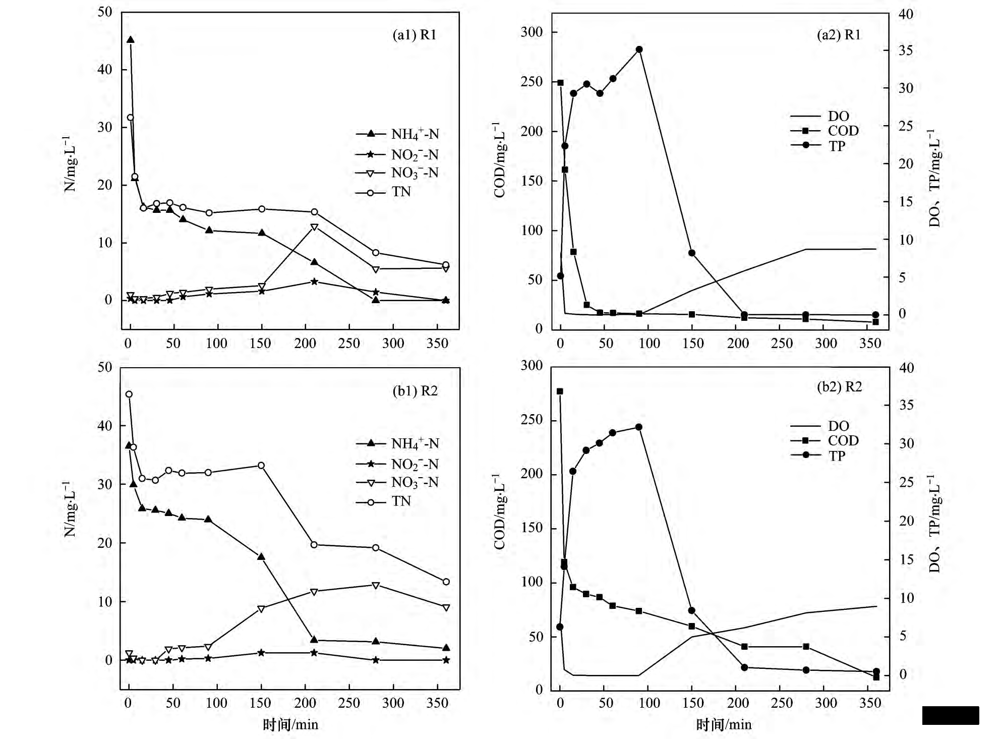 圖 6 為 R1、R2 在第 128 d 的一個(gè)典型周期內(nèi)NH + -N、NO - -N、NO - -N、TN、COD、TP、溶解氧4 2 3( DO) 的濃度變化. 厭氧階段,R1、R2 反應(yīng)器內(nèi)的DO 濃度在 0. 02 mg·L - 1 以下,好氧階段,R1、R2中 DO 緩慢增加,最終穩(wěn)定在 8 mg·L - 1 左右,反應(yīng)器內(nèi)具有良好的 A/ O 運(yùn)行環(huán)境. R1 中 COD 濃度在厭氧階段下降較快,在前 30 min 已經(jīng)基本消耗,COD 由 250 mg·L - 1 降至 25. 12 mg·L - 1 . R2 反應(yīng)器進(jìn)水為生活污水,在厭氧階段,由于有機(jī)物成分復(fù)雜,微生物可快速利用的有機(jī)碳源較少,所以降解速度較慢, COD 由 275. 19 mg·L - 1 降至 90. 44mg·L - 1 ; 在好氧階段,反硝化作用消耗有機(jī)碳源,COD 濃度逐漸降低至 24. 58 mg·L - 1 ,COD 得到去除. 在厭氧末期,R1 釋磷較多,反應(yīng)器內(nèi)的 TP 濃度為 35. 09 mg·L - 1 ,而 R2 反應(yīng)器內(nèi)的 TP 濃度為32. 18 mg·L - 1 . 導(dǎo)致釋磷量不同的主要原因?yàn)樯钗鬯泻新偕锝到馕镔|(zhì)和溶解性惰性物質(zhì)等不利于聚磷菌利用的有機(jī)物,在厭氧階段不能夠完全降解,降低了釋磷量. 在周期實(shí)驗(yàn)出水中,R1、R2 出水均未檢測(cè)到NH + -N、NO - -N,出水NO - -N濃度分別為 5. 65 mg·L - 1 、9. 67 mg·L - 1 ,產(chǎn)生這種現(xiàn)象的原因?yàn)椋€(wěn)定運(yùn)行時(shí),R1 中顆粒污泥粒徑較R2 大,由于好氧顆粒污泥內(nèi)部存在一個(gè)“缺氧區(qū)”,粒徑越大,顆粒污泥內(nèi)部的缺氧區(qū)越大,這為反硝化菌提供了良好的生存環(huán)境,提高了反硝化能力,因此 R1 反應(yīng)器內(nèi)NO - -N的出水效果更好.