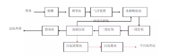 污水處理系統(tǒng)由調(diào)節(jié)池、缺氧池、好氧池(接觸氧化池)、二沉池組成。來(lái)自生產(chǎn)車(chē)間的污水自流入調(diào)節(jié)池,調(diào)節(jié)池入口設(shè)機(jī)械格柵,以攔截大顆粒狀和纖維狀雜質(zhì),在調(diào)節(jié)池中污水充分地混合,調(diào)節(jié)水量并初步降解有機(jī)物,然后通過(guò)污水泵將污水輸入氣浮池,去除油污,懸浮物進(jìn)入缺氧池,在缺氧池中回流混合液與原污水充分混合,通過(guò)兼氧微生物的作用,將亞硝酸氮和硝酸氮轉(zhuǎn)化為氮?dú)猓瓿煞聪趸摰?,缺氧池出水自流入接觸氧化池。接觸氧化池是一種以生物膜法為主,兼有活性污泥法的生物處理裝置,通過(guò)鼓風(fēng)機(jī)提供氧源,使污水中的有機(jī)物與池內(nèi)生物膜充分接觸,經(jīng)微生物吸附、降解作用,使水質(zhì)得到凈化。二沉池出水進(jìn)入混凝沉淀,進(jìn)一步去除污染物,使出水達(dá)標(biāo)排放。