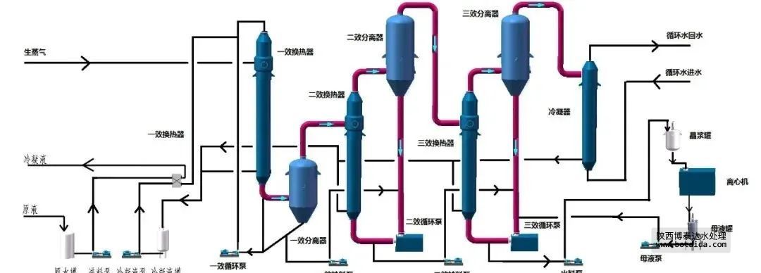 三組蒸發(fā)器以串聯(lián)的形式運(yùn)行,組成三效結(jié)晶蒸發(fā)器。整套蒸發(fā)系統(tǒng)采用連續(xù)進(jìn)料、連續(xù)出料的生產(chǎn)方式。高含鹽廢水首先進(jìn)入一效強(qiáng)制循環(huán)結(jié)晶蒸發(fā)器,結(jié)晶蒸發(fā)器配有循環(huán)泵,將廢水打人蒸發(fā)換熱室,在蒸發(fā)換熱室內(nèi),外接蒸氣液化產(chǎn)生汽化潛熱,對廢水進(jìn)行加熱。由于蒸發(fā)換熱室內(nèi)壓力較大,廢水在蒸發(fā)換熱室中在高于正常液體沸點(diǎn)壓力下加熱至過熱.加熱后的液體進(jìn)入結(jié)晶蒸發(fā)室后,廢水的壓力迅速下降導(dǎo)致部分廢水閃蒸,或迅速沸騰。廢水蒸發(fā)后的蒸氣進(jìn)人二效強(qiáng)制循環(huán)蒸發(fā)器作為動(dòng)力蒸氣對二效蒸發(fā)器進(jìn)行加熱,未蒸發(fā)廢水和鹽分暫存在結(jié)晶蒸發(fā)室。一效、二效、三效強(qiáng)制循環(huán)蒸發(fā)器之間通過平衡管相通,在負(fù)壓的作用下,高含鹽廢水由一效向二效、三效依次流動(dòng),廢水不斷地被蒸發(fā),廢水中鹽的濃度越來越高,當(dāng)廢水中的鹽分超過飽和狀態(tài)時(shí),水中鹽分就會(huì)不斷地析出,進(jìn)入蒸發(fā)結(jié)晶室的下部的集鹽室.吸鹽泵不斷將含鹽的廢水送至旋渦鹽分離器,在旋渦鹽分離器內(nèi),固態(tài)的鹽被分離進(jìn)入儲(chǔ)鹽池,分離后的廢水進(jìn)入二效強(qiáng)制循環(huán)蒸發(fā)器加熱,整個(gè)過程周而復(fù)始,實(shí)現(xiàn)水與鹽的最終分離.